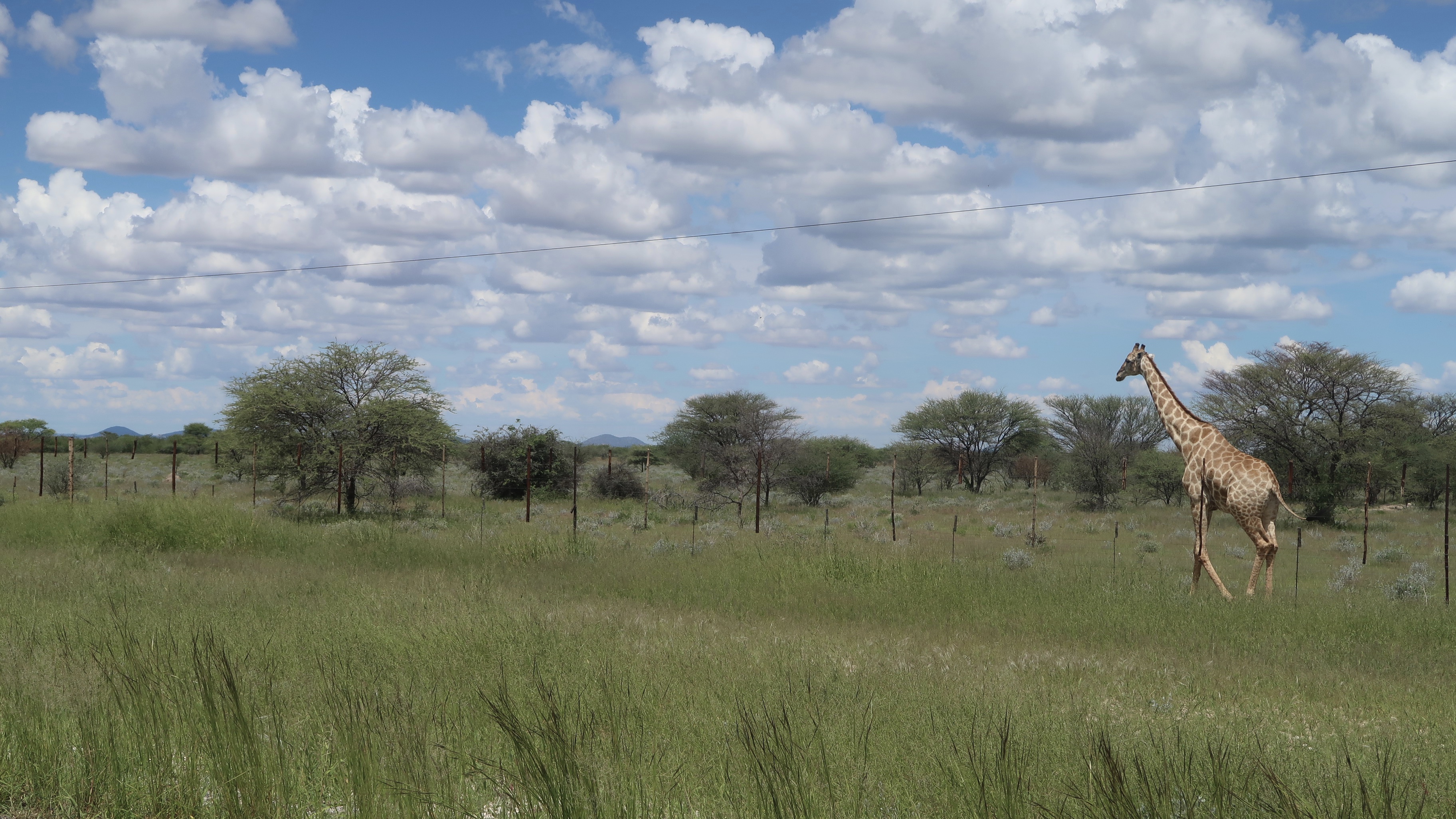 On the horizon, the sky reflected on the shiny green salt pan at Etosha. Since it was the tail end of the rainy season, it was a beautiful composition, while the big cats were in hiding, blending in with the tall grass. There was nobody home at our game drive, except for one giraffe and a couple of jumbo ostriches.