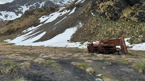 Once ashore, we trekked through thick mounds of tussock grass where fur seals were tucked away in deep sleep. we made our way toward the foot of the mountain to find the remains of a rusty steam locomotive, a mechanical ghost once used to haul coal and supplies to and from ships. A few penguins posed in front of a refurbished shed, a relic of the whaling era now used by visiting researchers.